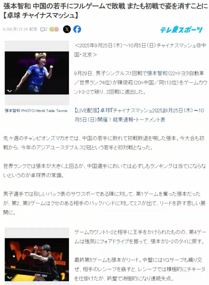 张本智和这场首轮出局,不仅让他自己措手不及,也让日本媒体当场打脸。