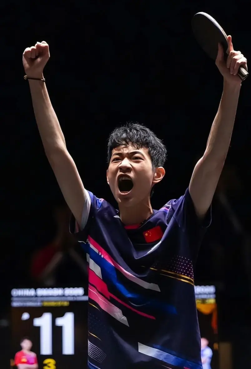 比赛期间他几乎没有多余表情,咬牙坚持、眼神专注、每一板都不放松,直到最后一个球落地,才终于举起双手庆祝。